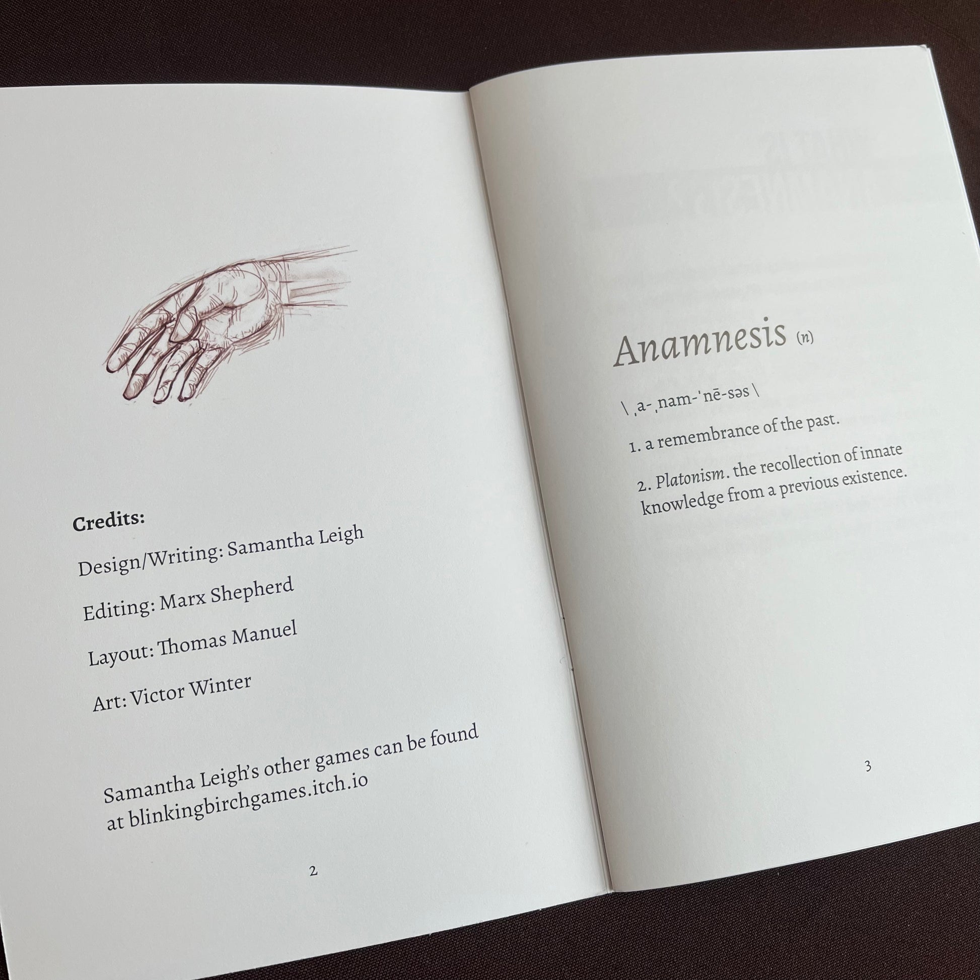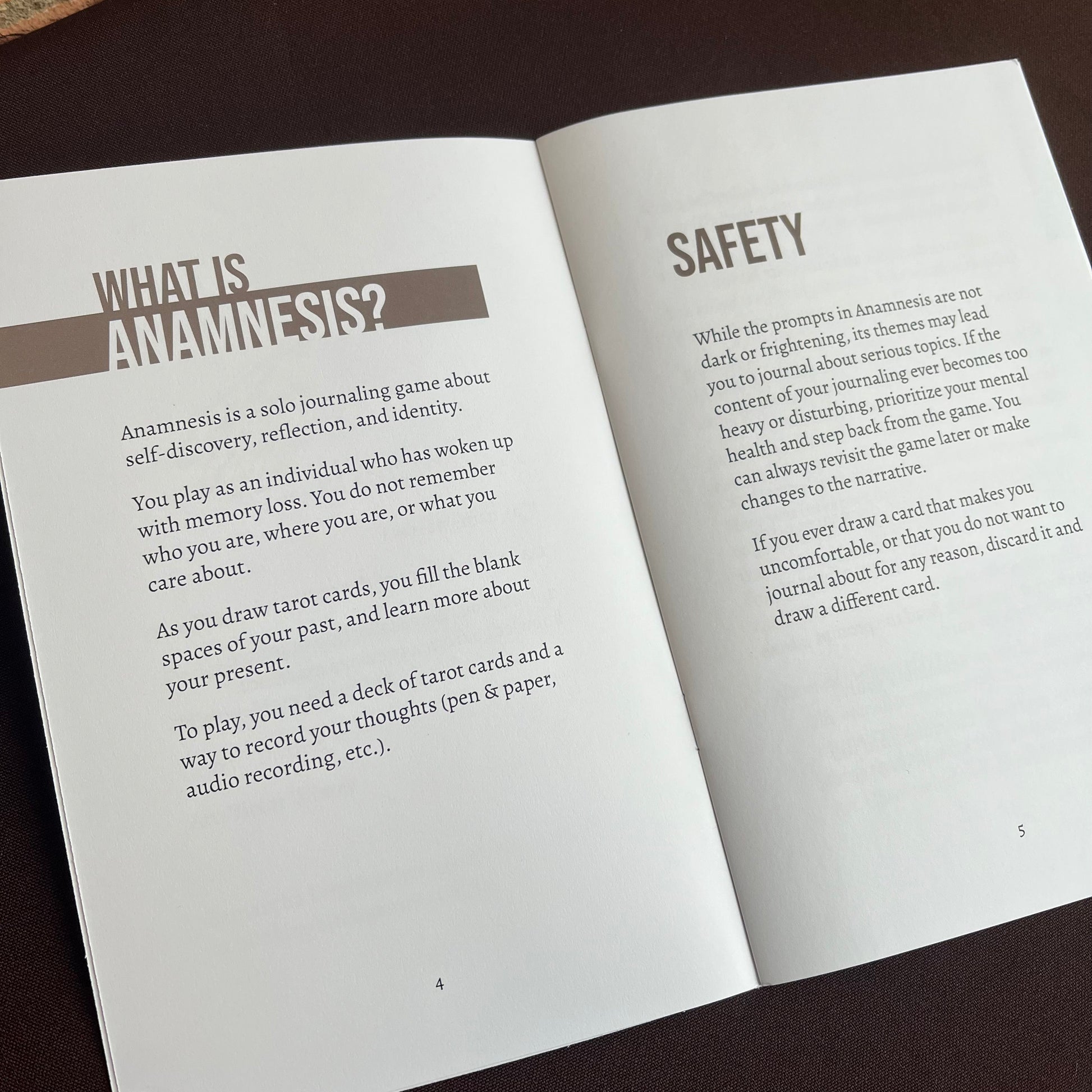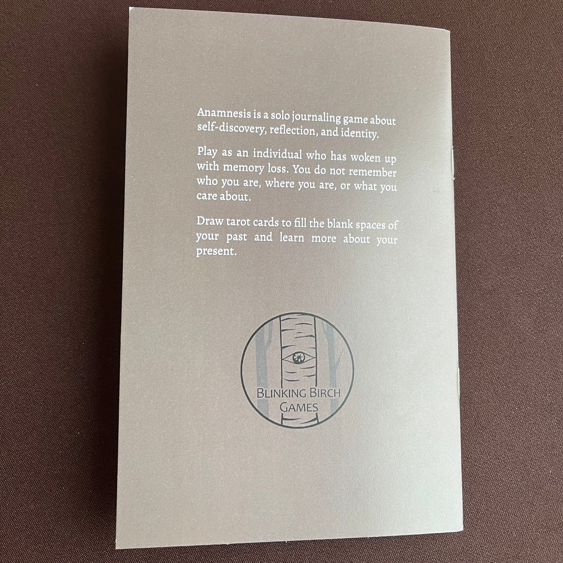 Anamnesis is a solo journaling RPG about self-discovery, reflection, and identity. You play as an individual who has woken up with memory loss. You do not remember who you are, where you are, or what you care about. As you draw tarot cards, you fill the blank spaces of your past and learn more about your present.