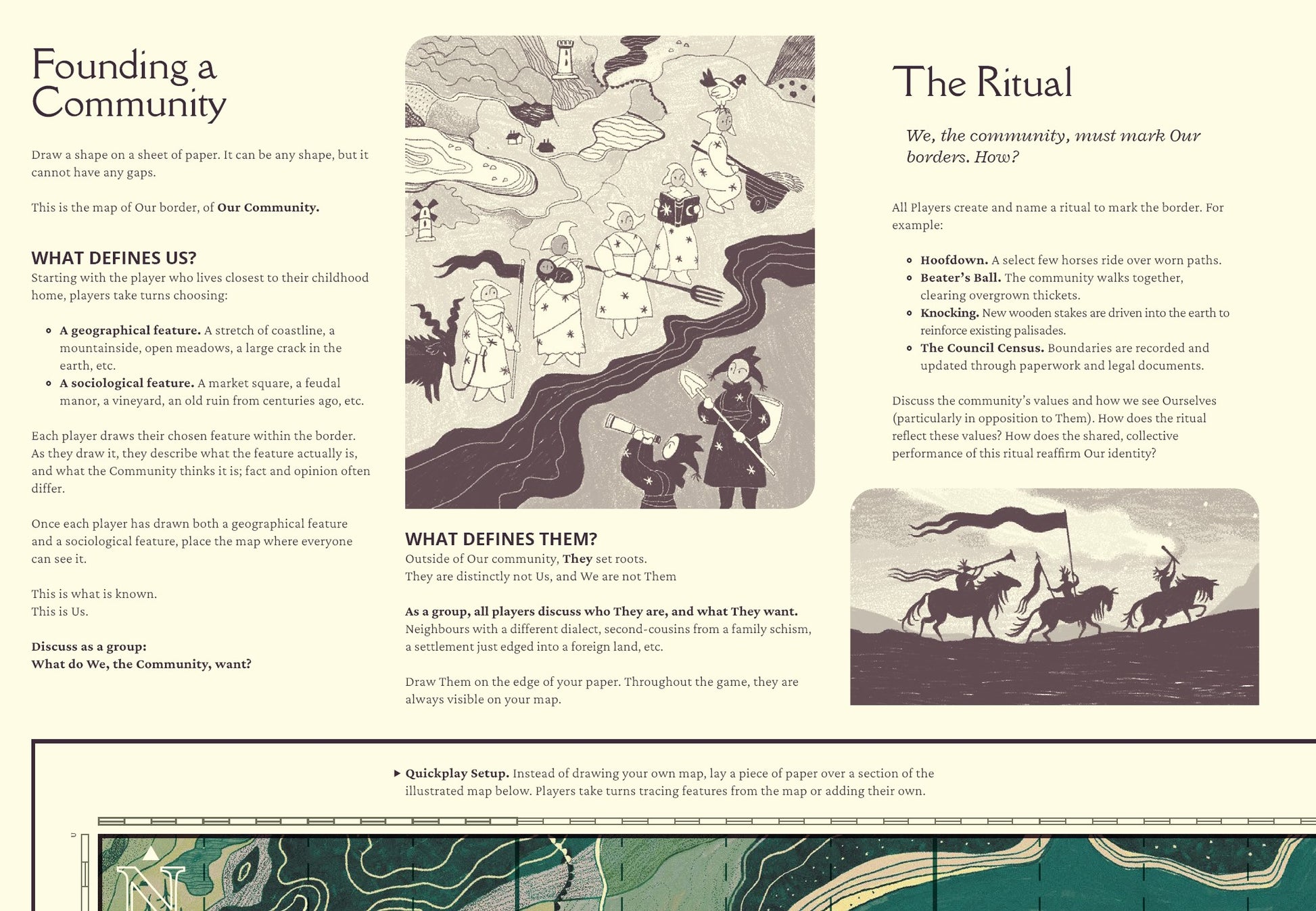 This is a game about boundaries, how we mark them and who we include or exclude from them. While inspired by the Common Ridings festivals in the Scottish Borders, this game can be about any community, and take place at any time, in any setting.