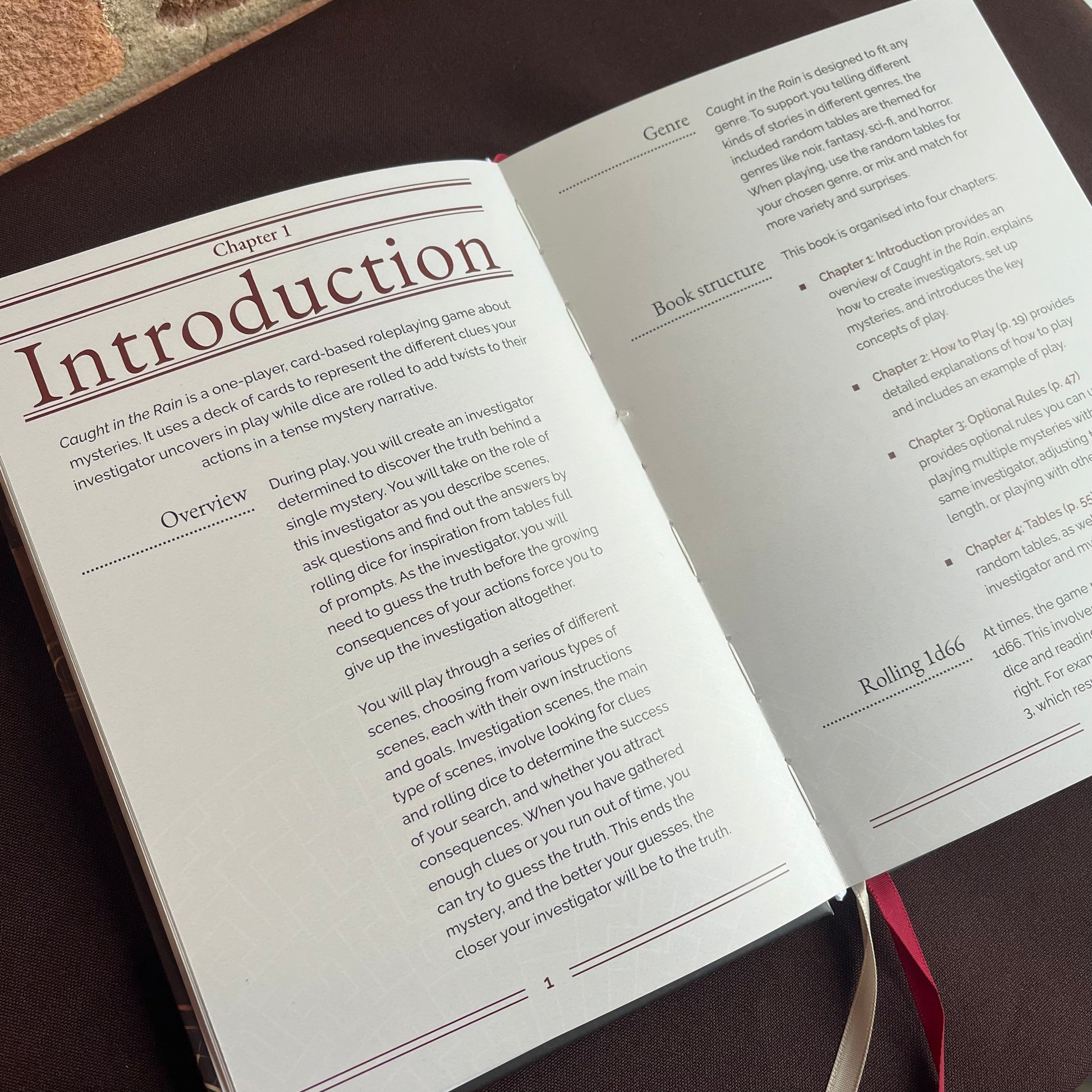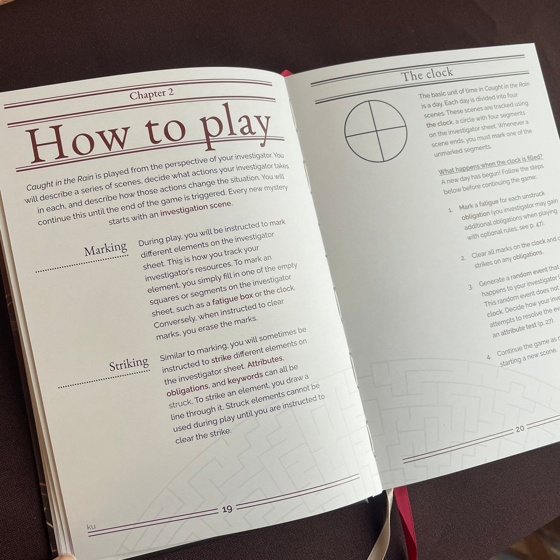 Caught in the Rain is a solo roleplaying game of investigative mystery. Whether you are a child searching for their lost brother, or a detective searching for a ruthless killer, Caught in the Rain solves the challenge of solo mysteries by keeping the truth hidden. This allows players to uncover satisfying, cohesive, and sometimes unexpected revelations as if guided by an unseen hand.