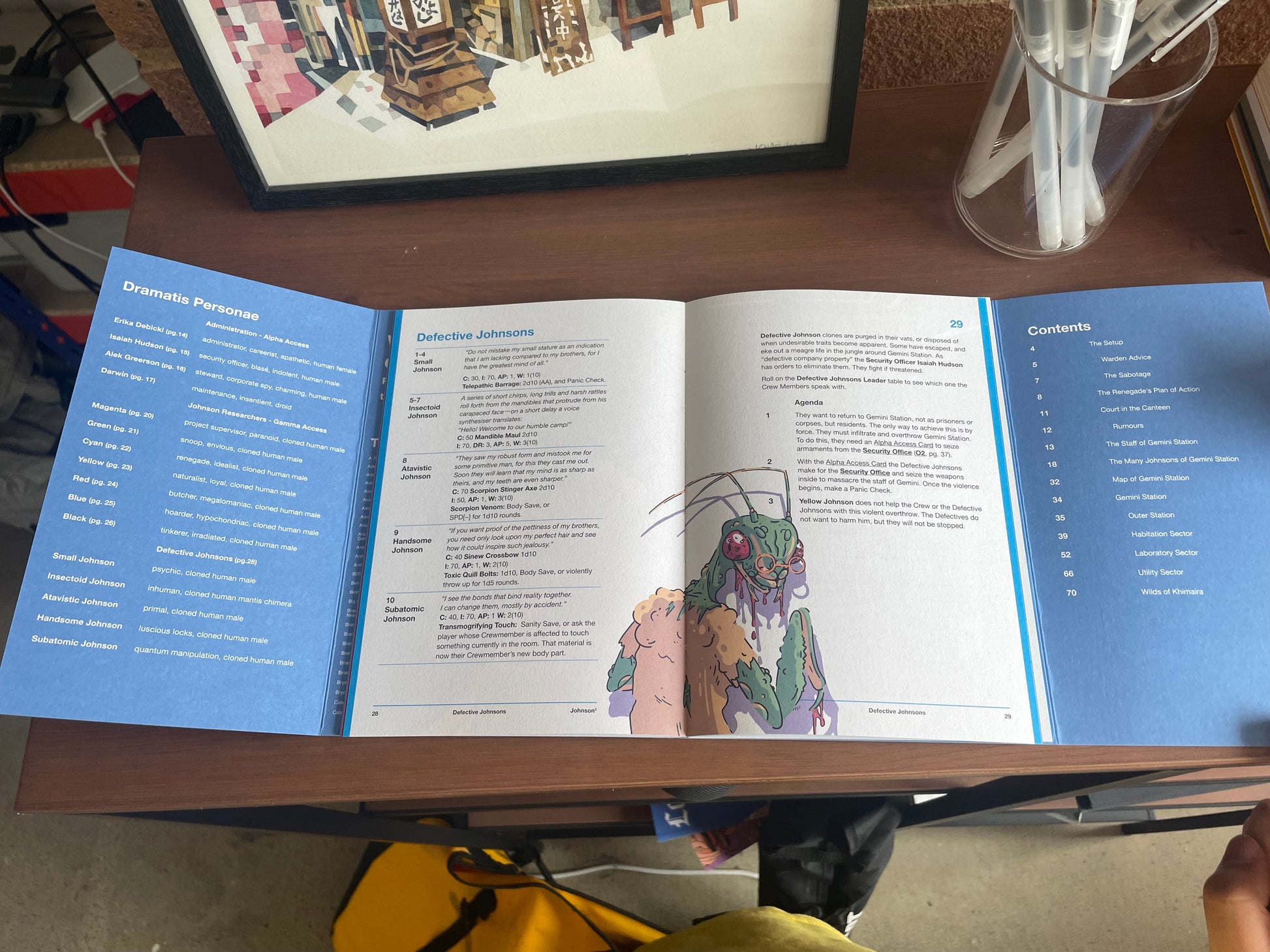 • Five so-called ‘Defective Johnsons’ eking out a hardscrabble life in the wild jungle around the station. Please note that their existence is purely speculative and Janus Corp will not tolerate rumours of defective clones living on any Janus Corp Property.
