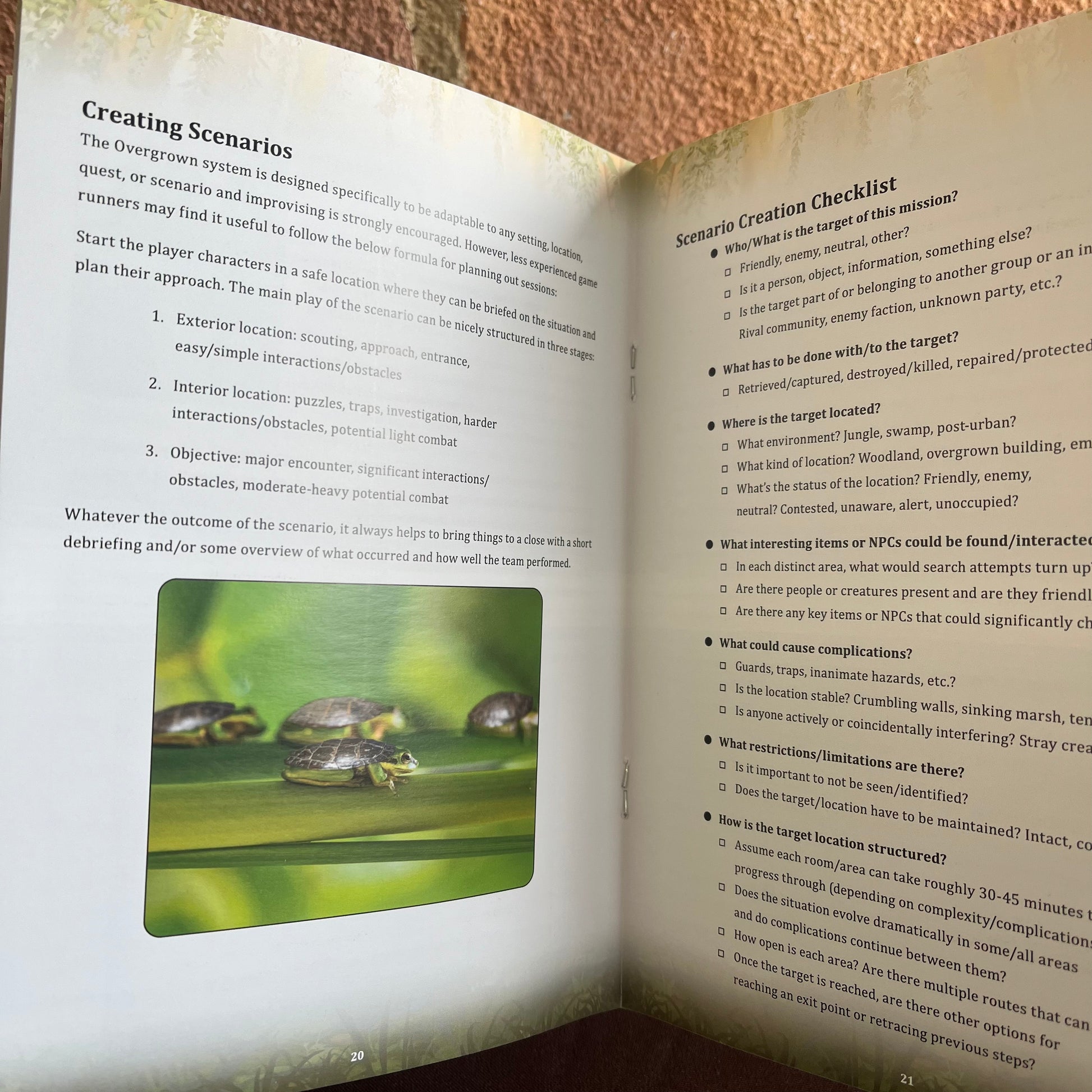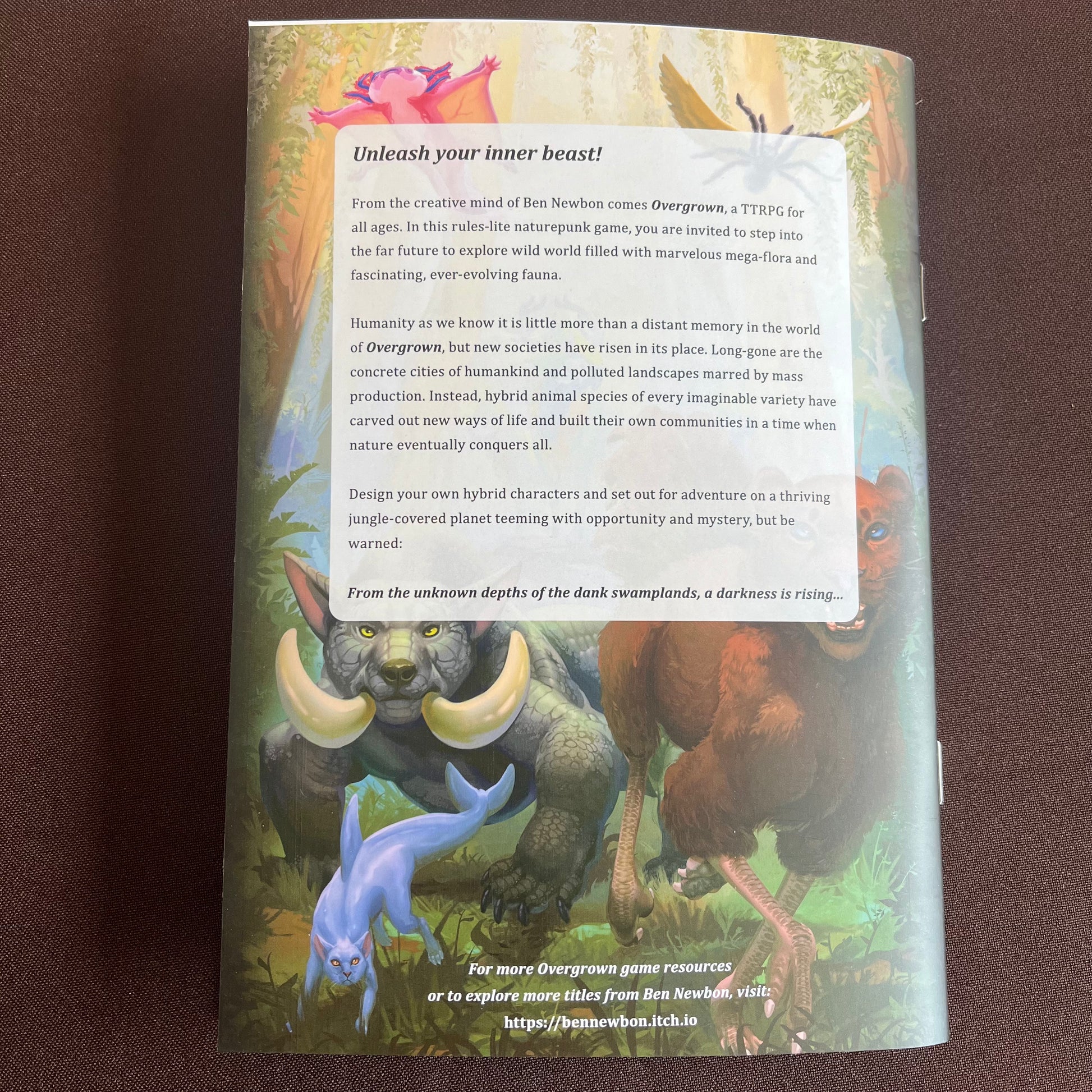 Overgrown is a rules-lite naturepunk TTRPG in which you create and play as rapidly evolving hybrids of literally any animal you can think of. Roam a far-future world where nature has fought back against humanity AND WON. Explore a jungle covered planet, trek vast continent stretching forests and delve into the dank swamplands where a dark element is arising to threaten life itself.