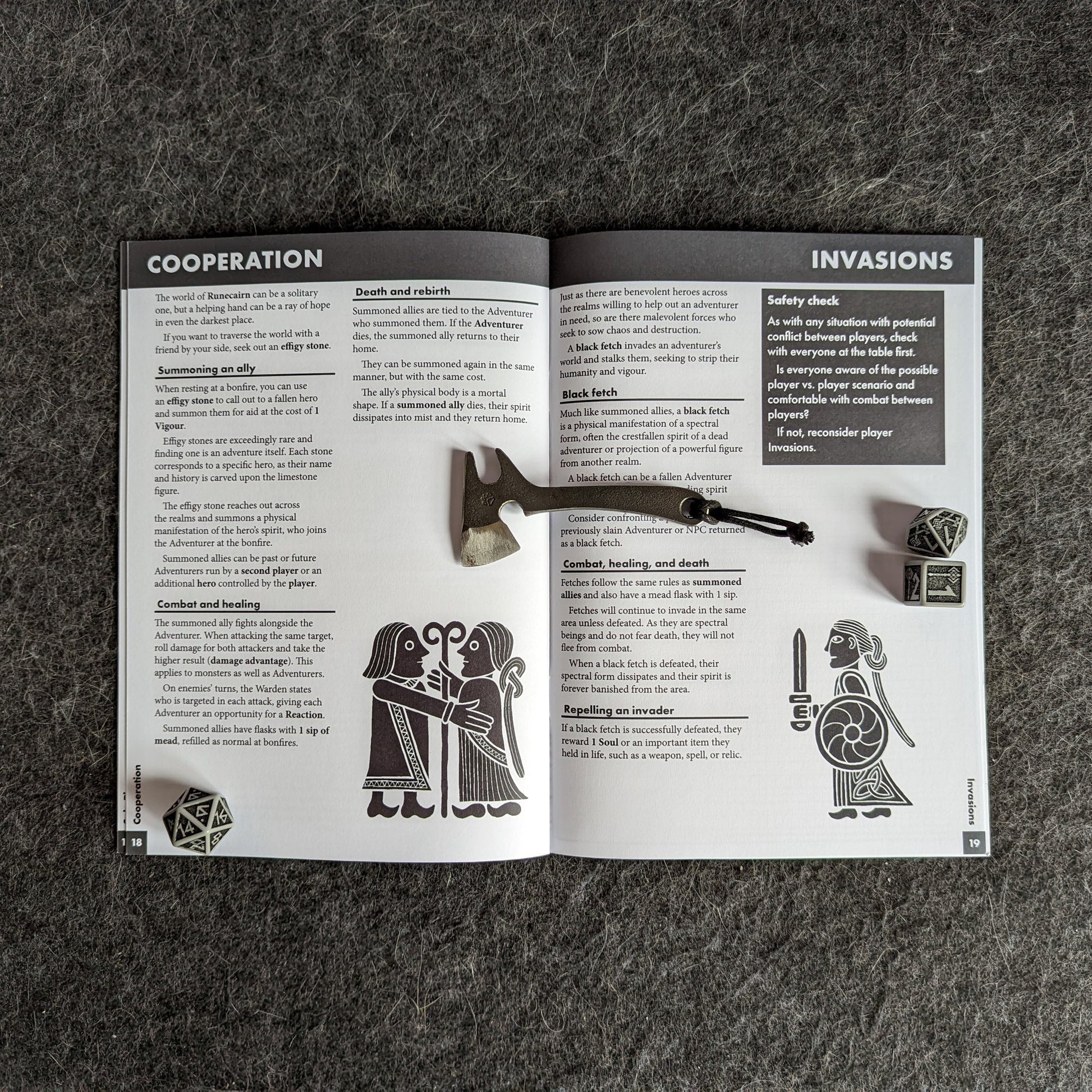 Balance favour and sorrow or read the runes to guide your way solo through a pre-written adventure, or conjure a random dungeon crawl with the delve generator.