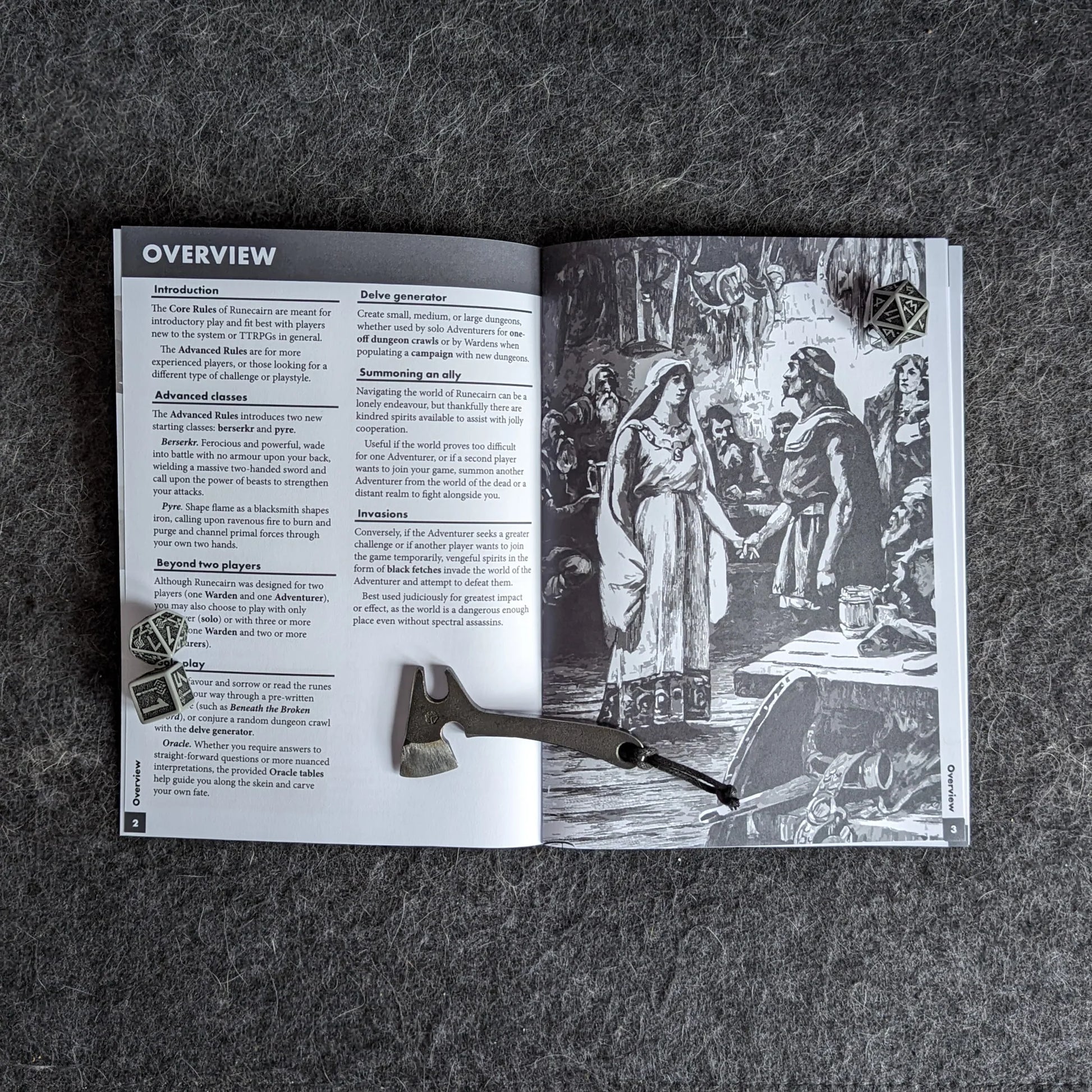 Runecairn: Advanced Rules is a 20-page, black and white tabletop RPG supplement for Norse fantasy roleplaying game Runecairn, adding new starting classes and optional rules. Runecairn is based on Cairn by Yochai Gal, with streamlined rules, fast character creation, and gameplay based on exploration and player choice.