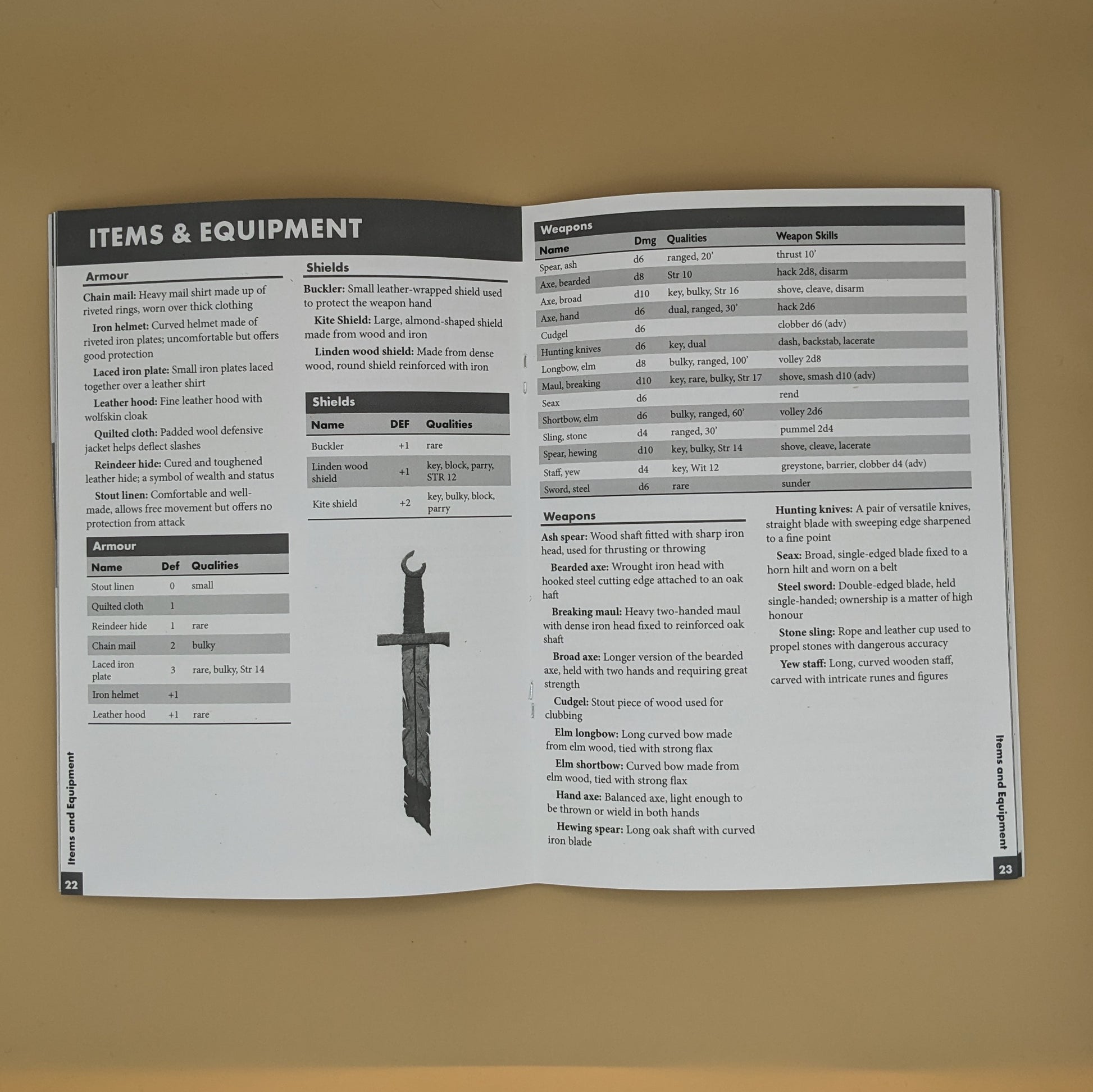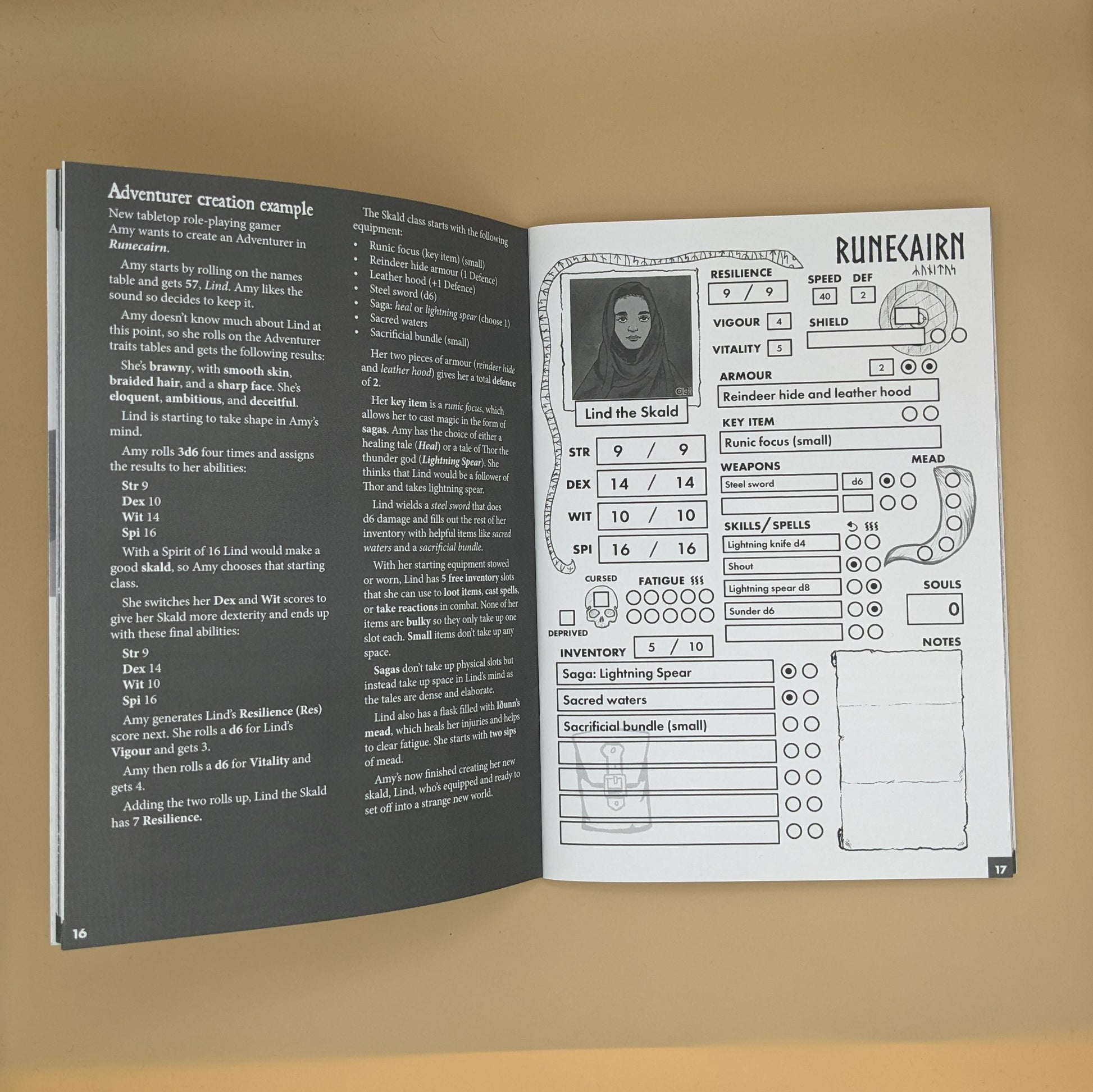 Runecairn: Core Rules is a 44-page, black and white tabletop RPG zine, which includes a Norse fantasy setting, a full game system, and character creation rules for adventures set after Ragnarok destroyed most of the Nine Realms of Norse mythology.