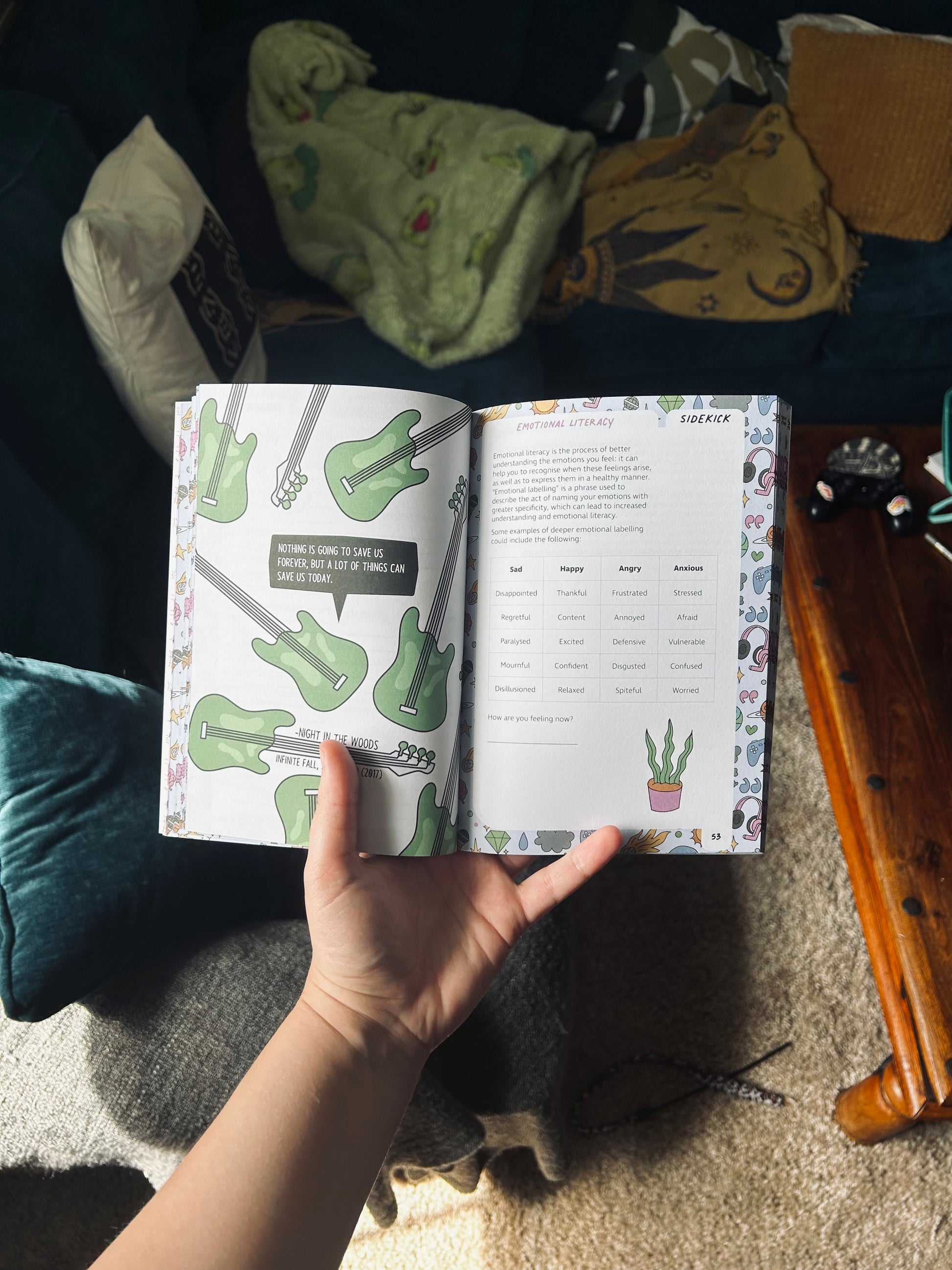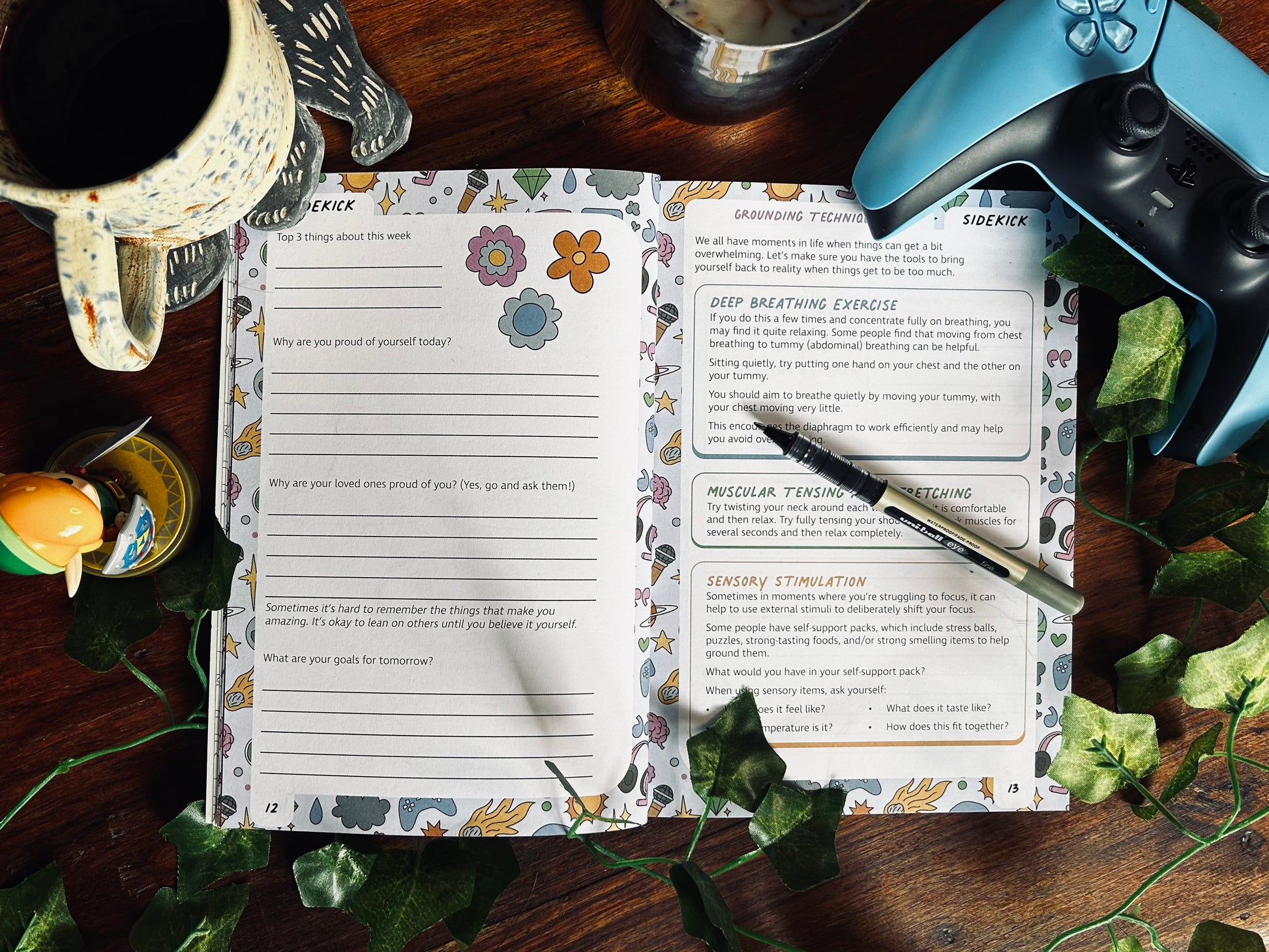 Sidekick: The Video Games Mental Health Journal is both a journal and a resource focused on improving the mental health of those in the games community (and anyone who needs it). By connecting you to the games you love so much, Sidekick will feel like a familiar friend who's there for you when you need it. Whether you need some time to free write and color or want some targeted help for what you’re going through in the form of breathing exercises and journaling prompts, Sidekick will be with you!