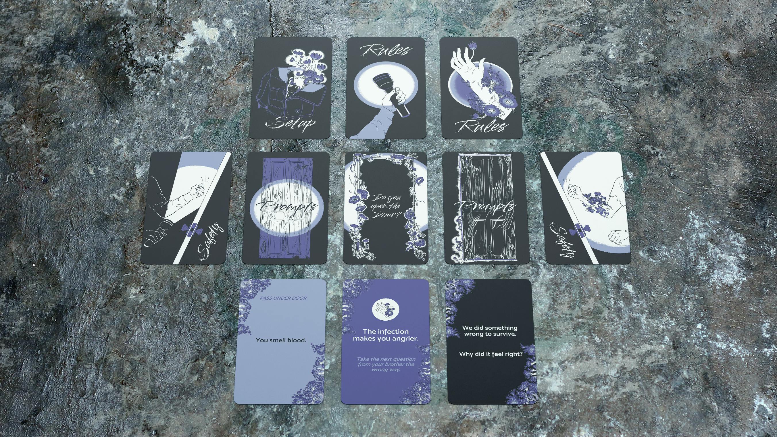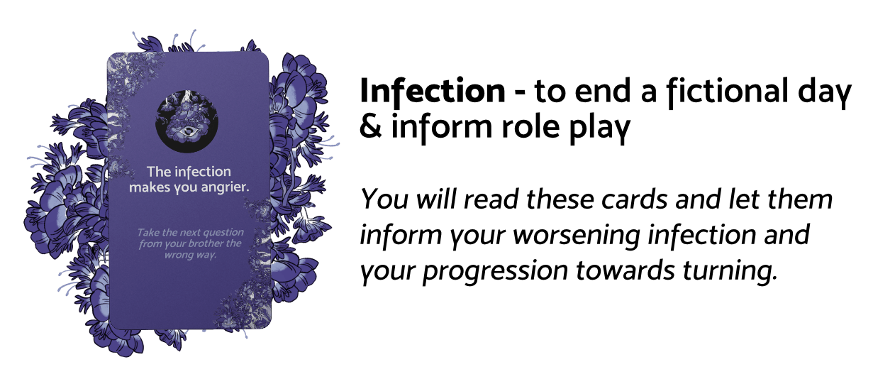 This two-player zombie TTRPG will guide you through the tragic and intimate story of two brothers and the final days before one of you turns. You will take turns drawing cards, asking questions, and processing this change together.