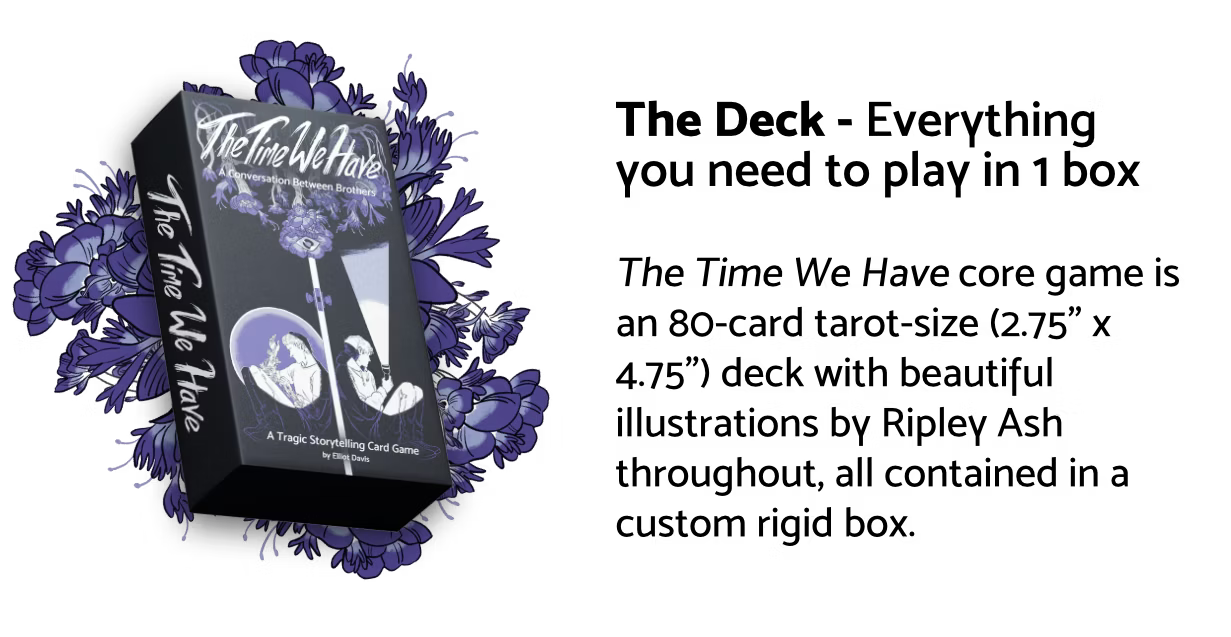The Time We Have is a game about what it means to be a brother—about all the complexity, vulnerability, and joy that comes with it. This is a storytelling card game played on opposite sides of a closed door and a conversation about saying goodbye.