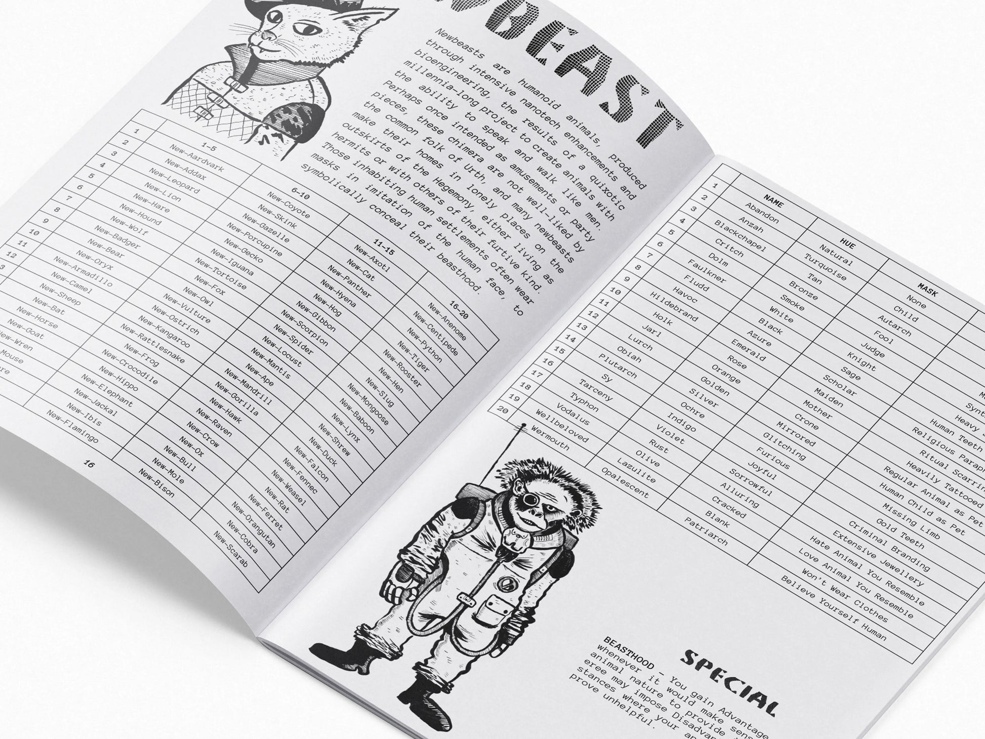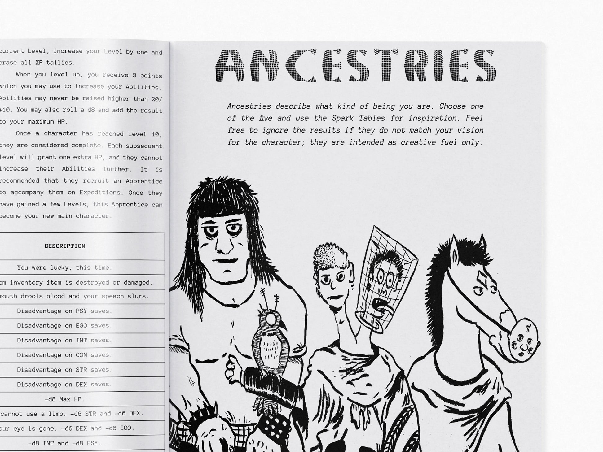 - Five player ancestries with detailed character generation tables. Play as a haughty true-kin, a mutated cacogen, a mechanical synth, a feral newbeast, or a fungal mycomorph.