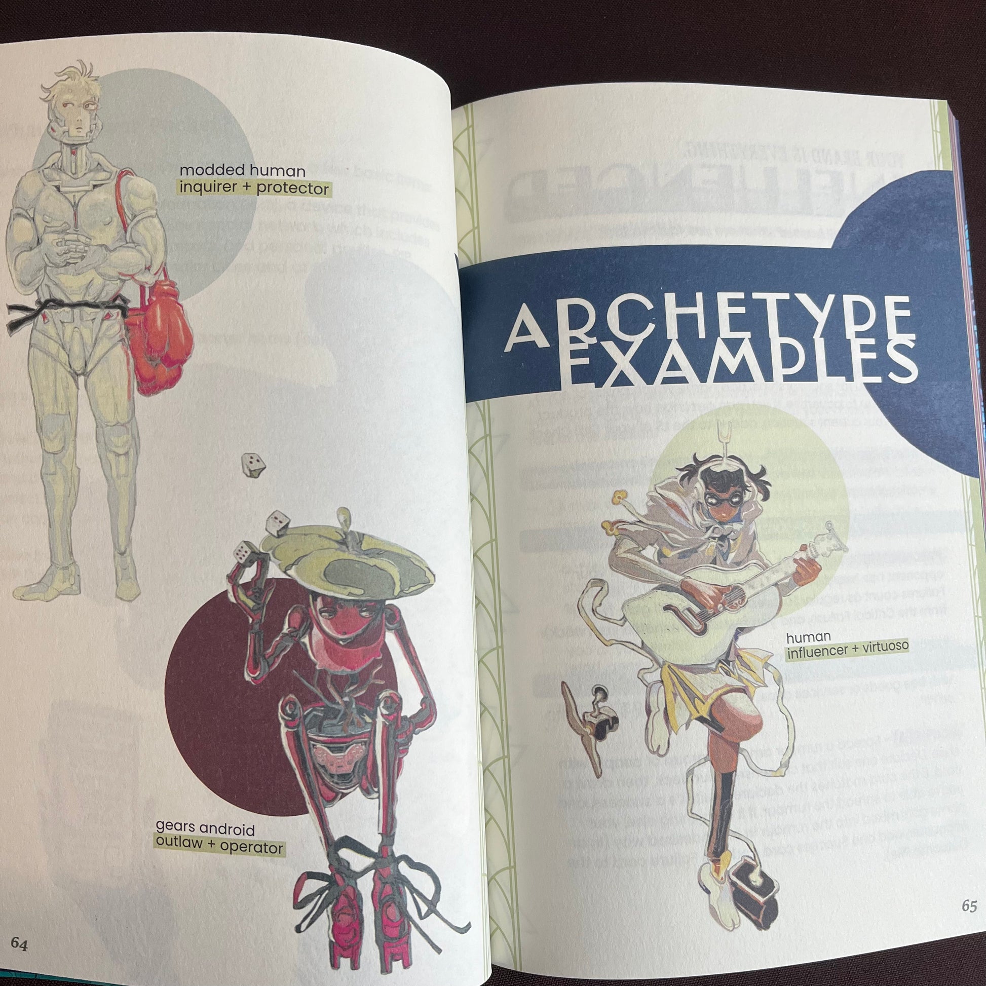 • Gameplay in multiple sessions, beginning with a collaborative Session 0 to detail the previous apocalypseImage shows an illustration of an android on the left hand side. This android is humanoid in shape, has a grey-lavender shell, a stern but gentle expression, and glowing amber eyes. The android wears a long red robe with a high collar and fur trim along the neck and sleeves. Text on the right-hand side reads: "FOR FANS OF: Final Fantasy 7 (video game) for intricate science fantasy storytelling. Paprika (2006 film) / Persona (video game franchise) for esoteric surrealistic dreamscapes. Cowboy Bebop (anime) for neo-noir, grey morality. Greek mythology, for intrusive and accessible deities. Blades in the Dark / The Wildsea / Imaginarium (TTRPGs) for collaborative worldbuilding, and fiction-first roleplaying.
