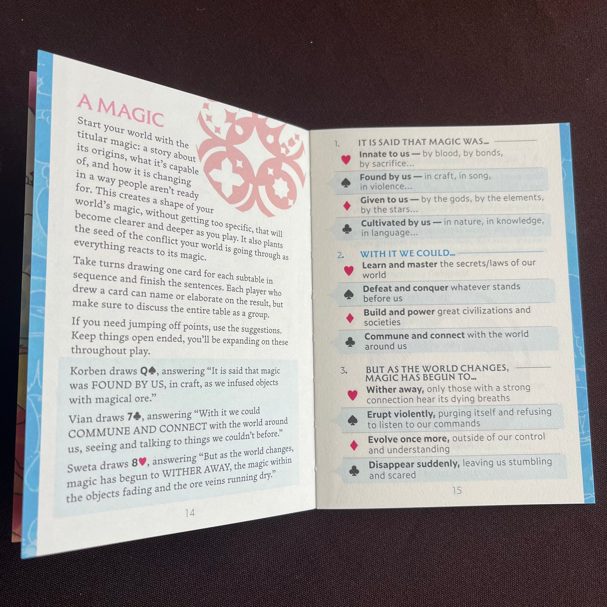 No two games will be alike. Player begin with establishing a palette and choosing touchstones for the world. From there, a variety of prompts and tables help bring their world to life.