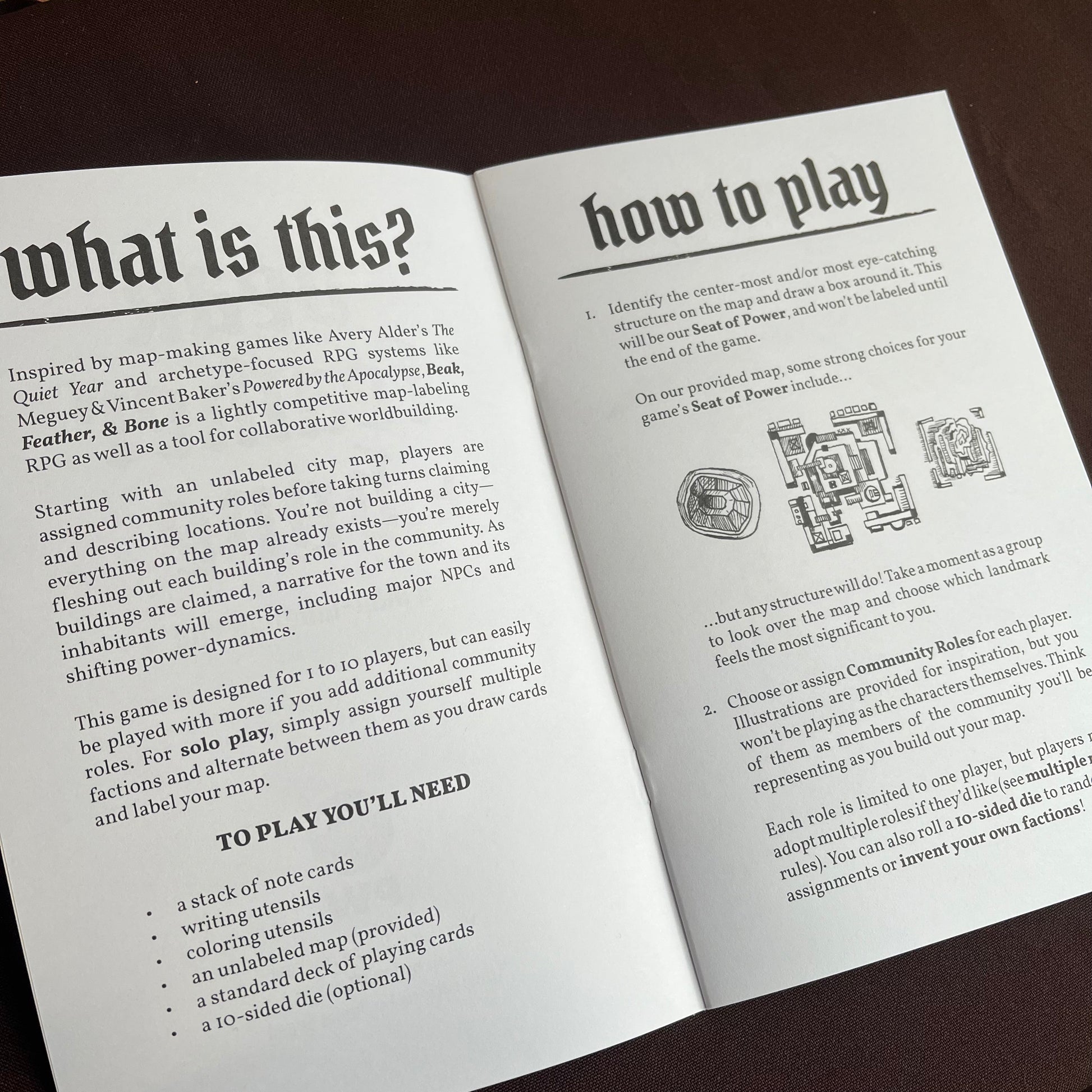 Beak, Feather, & Bone is a collaborative worldbuilding tool as well as a competitive map-labeling RPG. Starting with an unlabeled city map, players are assigned community roles before taking turns claiming and describing locations. Players draw from a standard 52-card deck to determine a building’s purpose and then describe its beak (reputation), feather (appearance), and bone (interior). As buildings are claimed, a narrative for the town and its inhabitants emerges, including major NPCs and shifting power-dynamics.