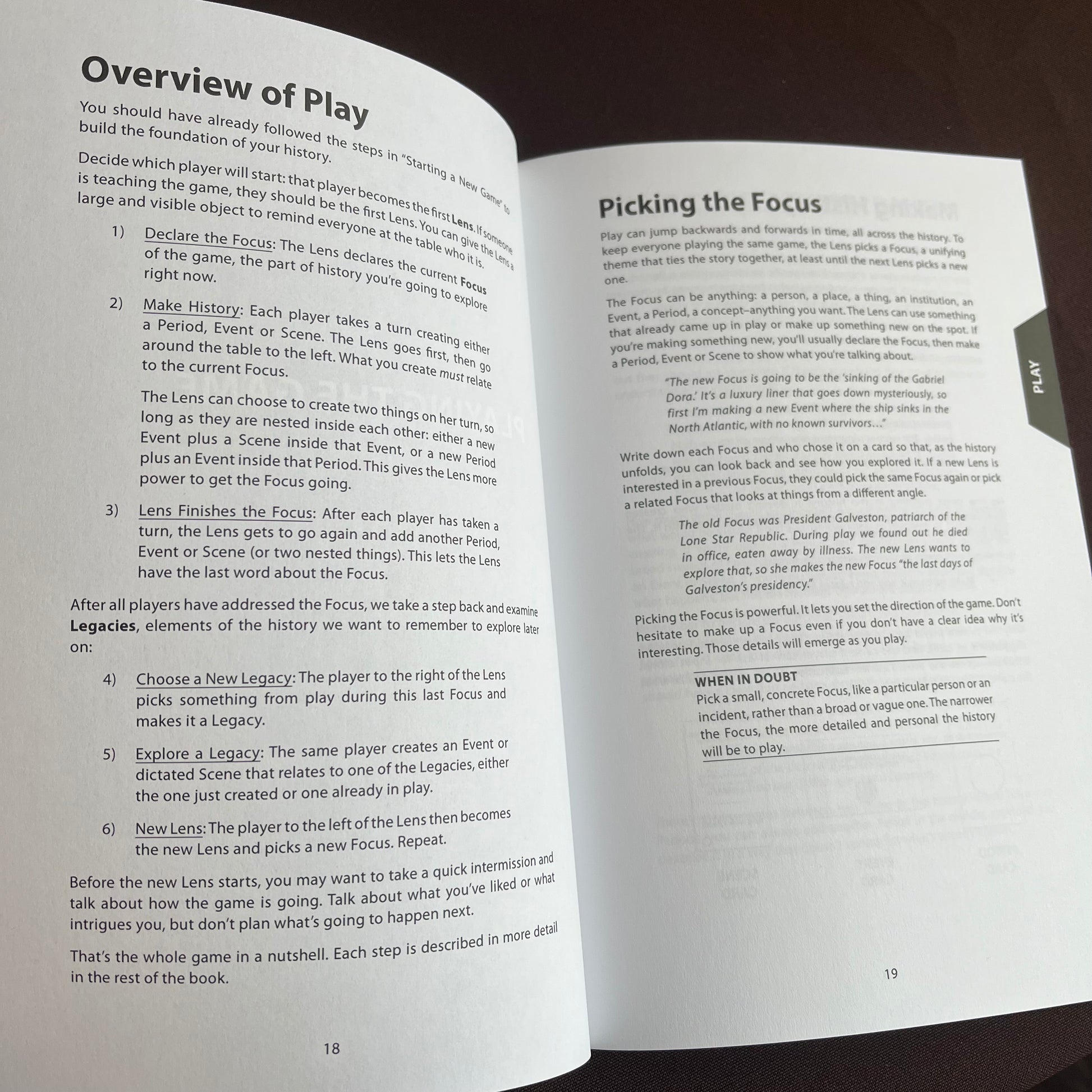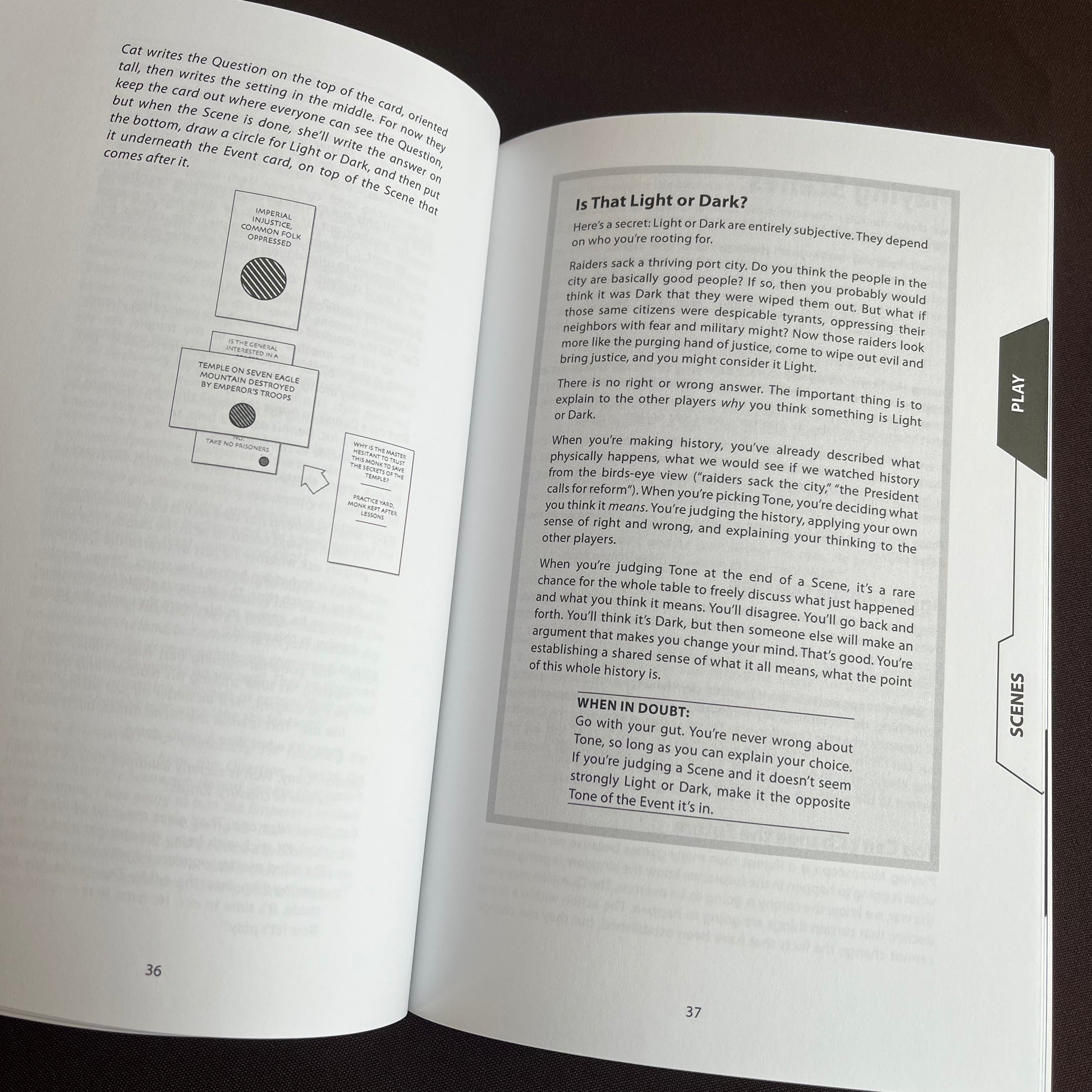 These are all examples of Microscope games. Want to explore an epic history of your own creation, hundreds or thousands of years long, all in an afternoon? That's Microscope.