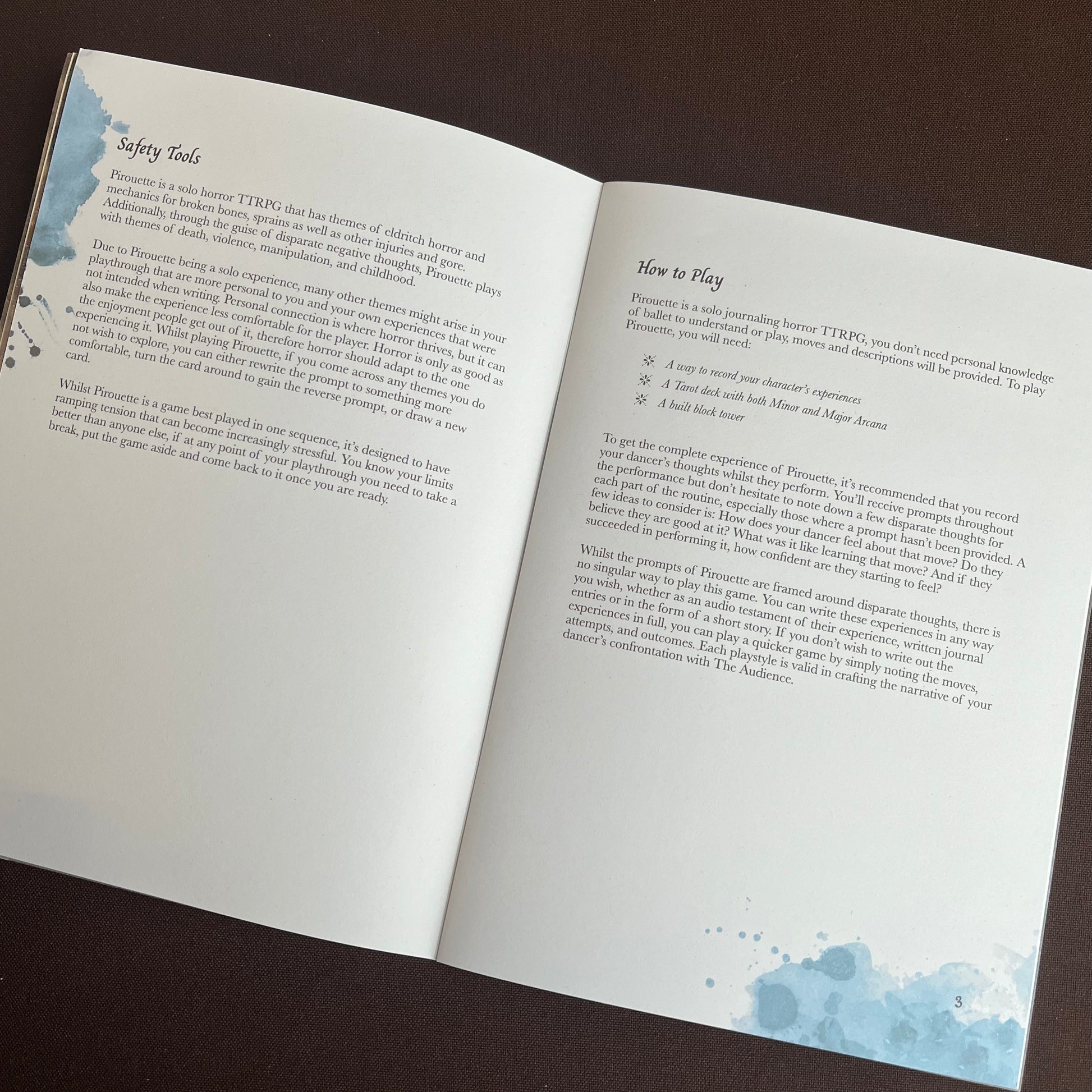 Pirouette is a solo horror TTRPG about a ballet dancer performing for an amorphous eldritch horror. Each move in your routine brings you closer to exhaustion, closer to that vital mistake which might just be the last you'll ever make.