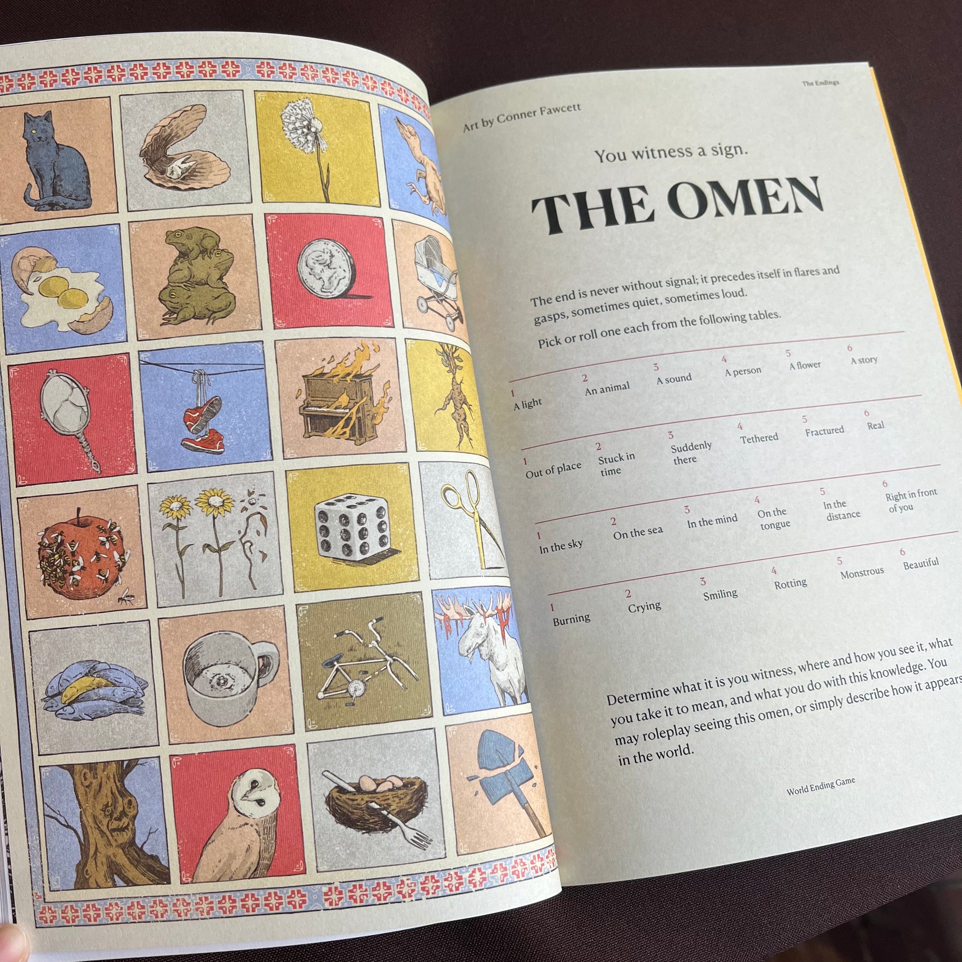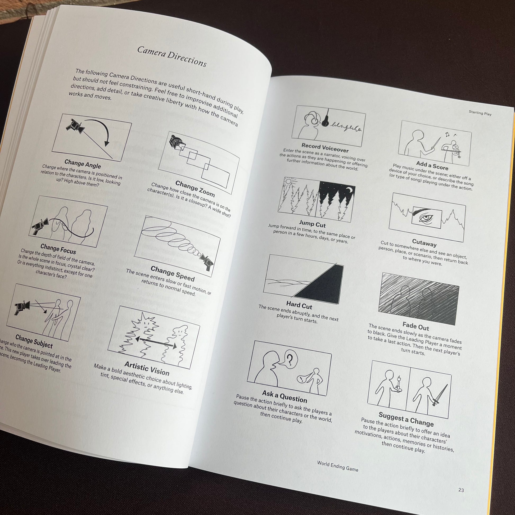 Inside of World Ending Game are a set of overarching rules for conversation, and then 20 small games, called Endings. These Endings form the scenes of World Ending Game, compounding and building on one another to form a session of play. Players pick scenes for their characters, while the GM takes on the role of The Director, controlling the camera, the lighting, the mood, and the frame for each Ending.